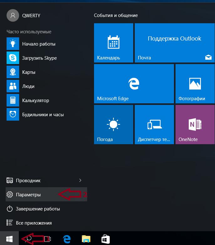 Нажмите «Пуск» и выберите пункт «Параметры»: