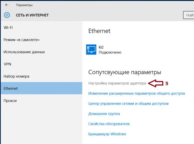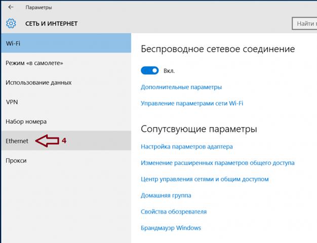 Откроется окно «Сеть и Интернет», в котором необходимо выбрать «Ethernet»: