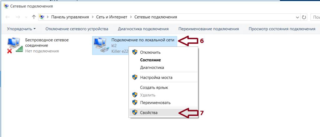 В открывшемся окне нажмите правой кнопкой мыши значок «Подключение по локальной сети» и выберите пункт «Свойства».