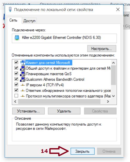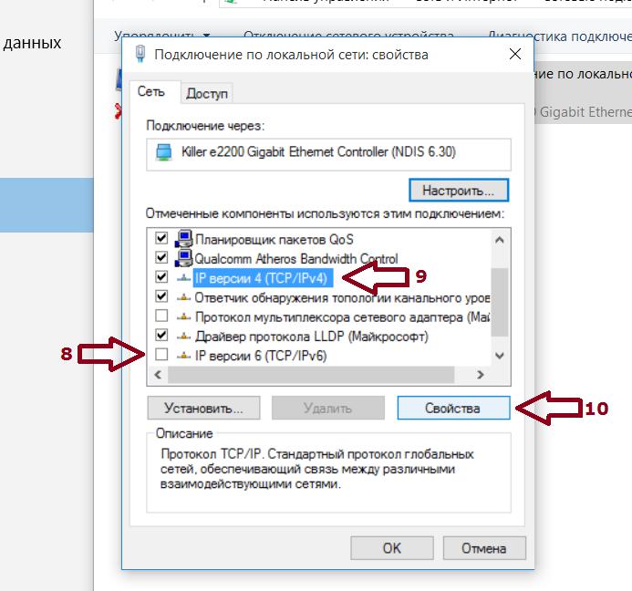 В диалоговом окне снимите галочку «IP версии 6 (TCP/IPv6)» и выделите пункт «IP версии 4 (TCP/IPv4)» (галочку не снимать) и нажмите кнопку «Свойства»:
