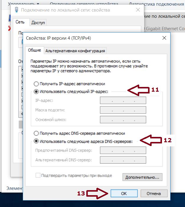 В открывшемся окне должны быть установлены точки «Использовать следующий IP адрес» и «Использовать следующие адреса DNS-серверов».